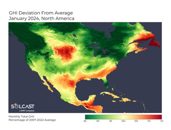 La mayor parte de Norteamérica registró una irradiancia inferior a la media, debido principalmente a las condiciones tormentosas que reinaron durante la segunda quincena de enero, según los datos analizados por Solcast a través de la API de Solcast. A pesar de un comienzo frío y seco en el norte, las bajas presiones sobre el Pacífico impulsaron la humedad a través de la costa oeste, proporcionando una irradiancia por debajo de la media. La humedad en el Golfo provocó nubes y lluvias sobre Florida, pero dejó una amplia franja de condiciones claras y secas y alta irradiancia desde México hasta las Carolinas.