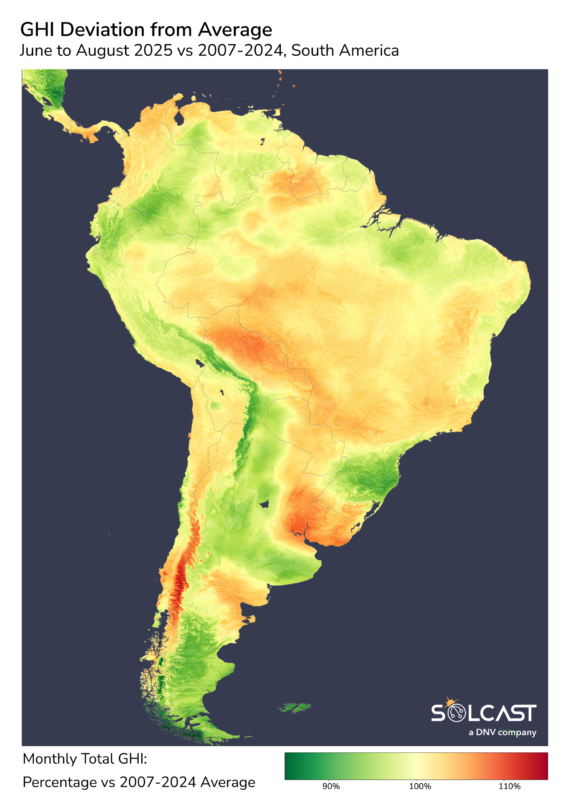 El invierno en Sudamérica trajo consigo fuertes contrastes mensuales para la generación solar, ya que la región experimentó oscilaciones entre condiciones inusualmente frías y cielos despejados. Mientras que junio y julio se compensaron en gran medida en términos de anomalías de irradiación, agosto cerró la temporada con condiciones más equilibradas, lo que dio lugar a un ligero aumento neto de la irradiación disponible en gran parte del continente. Mientras tanto, el frío extremo en el cono sur puso a prueba los sistemas energéticos y provocó fenómenos invernales poco habituales en algunas de las regiones más soleadas del mundo, según el análisis realizado con la API de Solcast.