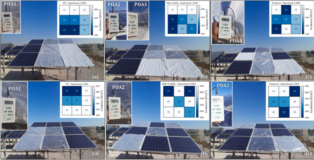 Además, el grupo validó los resultados de su simulación mediante un montaje experimental, que se instaló en Doha durante dos días consecutivos de septiembre. La irradiancia horizontal global (GHI) alcanzó un pico de 900 W/m², mientras que las temperaturas alcanzaron un máximo de 43 °C. Utilizaron un conjunto fotovoltaico de 3×3, compuesto por módulos policristalinos de 240 W, y emplearon materiales geotextiles para replicar los patrones de sombreado teóricos.