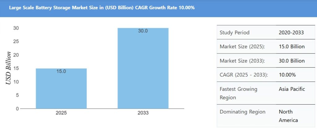 Un reciente informe de HTF Market Intelligence, titulado “Global Large Scale Battery Storage Industry Report – Analysis by Key Trends, Growth Factors, Competition and Market Size Breakdown [2020 – 2033]” (Informe de la industria global de almacenamiento de baterías a gran escala: análisis por tendencias clave, factores de crecimiento, competencia y desglose del tamaño del mercado [2020-2033]) indica que el mercado mundial de almacenamiento de energía a gran escala se estimó en 15.000 millones de dólares en 2025 y se proyecta que alcance los 30.000 millones de dólares para 2033, con un ritmo de crecimiento del 10 % durante el período previsto de 2025 a 2033.