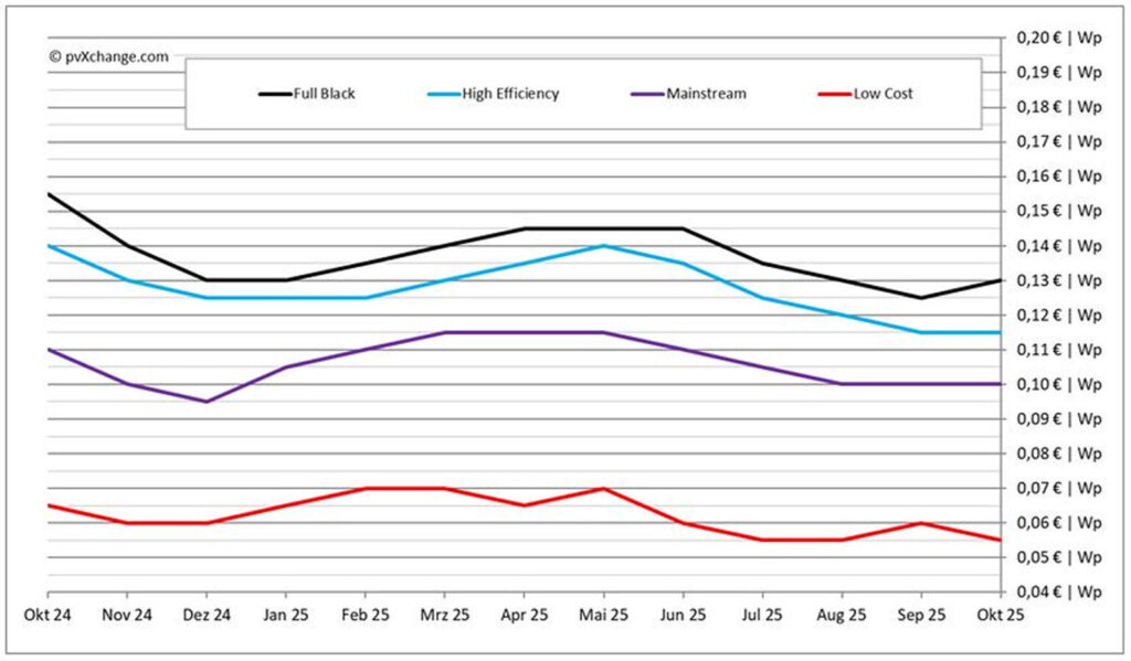 Los precios de los módulos en todas las clases tecnológicas están experimentando ligeras subidas y bajadas, sin una tendencia clara a largo plazo. Las fluctuaciones de precios reflejan en gran medida la dinámica actual de la demanda: el sector de las pequeñas instalaciones se está reduciendo, lo que provoca una disminución de las ventas de módulos totalmente negros. Las empresas de EPC y los fabricantes se centran cada vez más en proyectos fotovoltaicos de mediana y gran escala, en los que los módulos de alta eficiencia están ganando terreno, aunque la competencia de precios sigue siendo intensa.