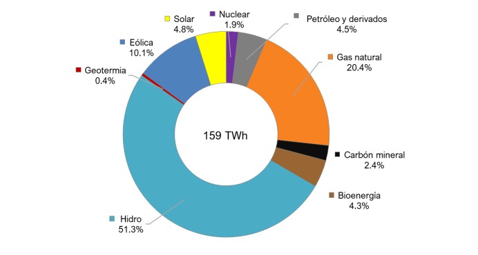 Las fuentes hidráulicas representaron el 51,3 % del total, seguidas por el gas natural con el 20,4 %, la eólica con el 10,1 % y la solar fotovoltaica con el 4,8 %.