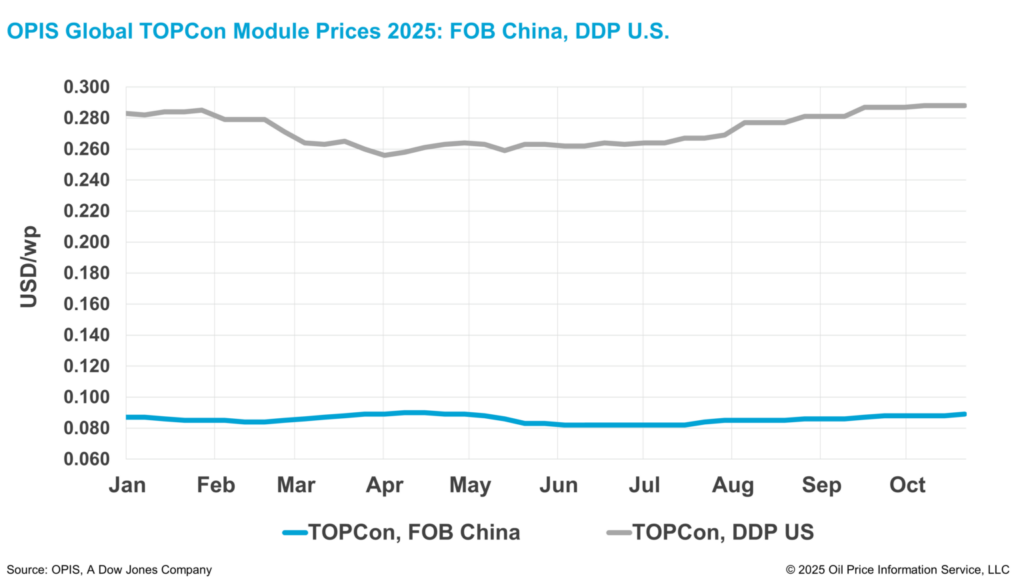 En los EE. UU., la evaluación del precio spot para módulos TOPCon de más de 600 W DDP EE. UU. se mantuvo esta semana en 0,288 dólares/W. Las cotizaciones para cargas desde India se mantuvieron en 0,331 dólares/W, mientras que las cotizaciones para cargas desde el Sudeste Asiático cayeron un 0,37 % hasta 0,271 dólares/W.