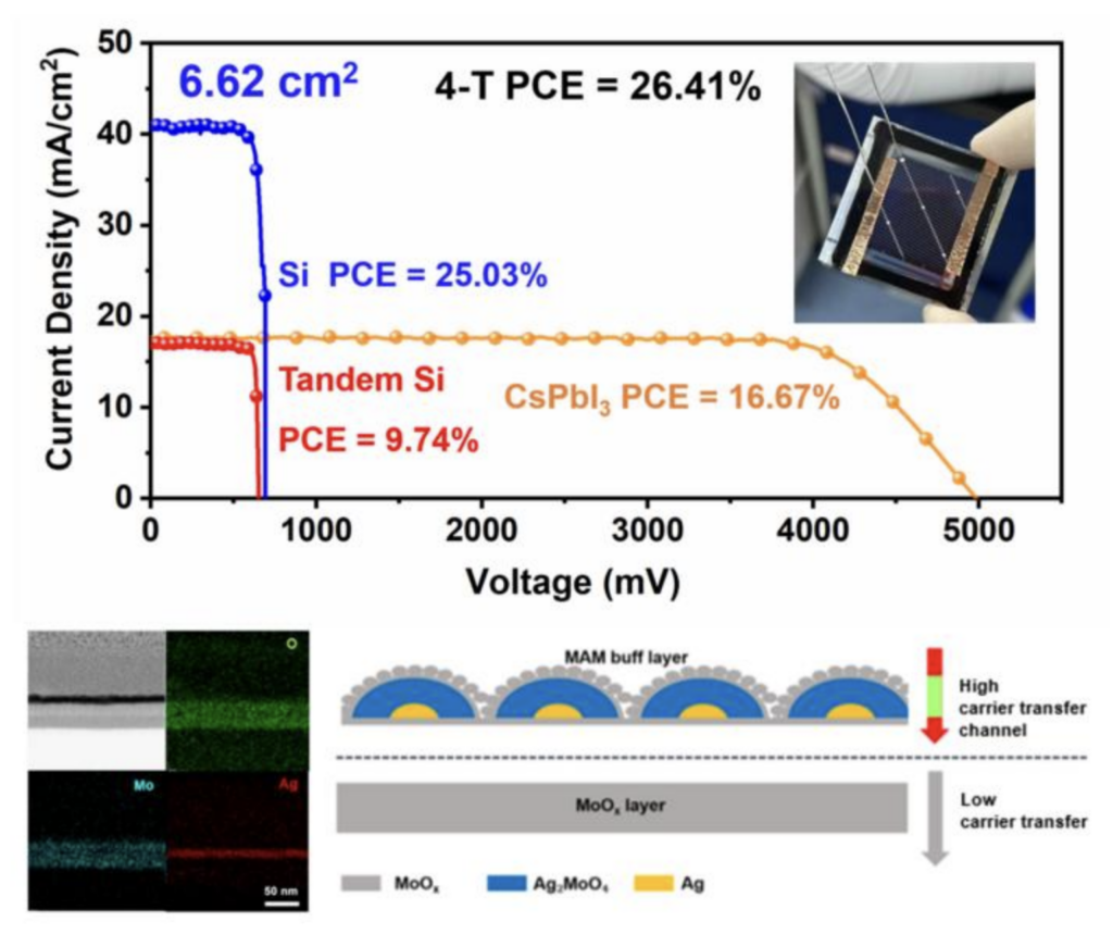 Sus hallazgos se presentan en el artículo de investigación «Designing MoOX/Ag/MoOX sandwich structured buffer layer for four-terminal CsPbI3/TOPCon tandem minimodules» (Diseño de una capa tampón con estructura tipo sándwich MoOX/Ag/MoOX para minimódulos tándem CsPbI3/TOPCon de cuatro terminales), disponible en la revista Materials Futures.