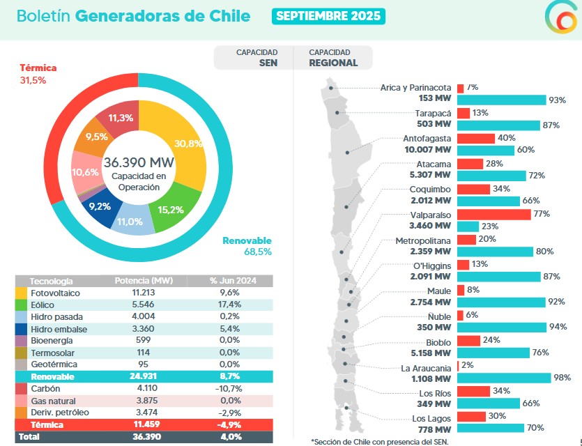 De acuerdo con el último boletín de Generadoras de Chile, la capacidad instalada fotovoltaica alcanza 11 276 MW, lo que la posiciona como la principal tecnología dentro del segmento de energías renovables del país.