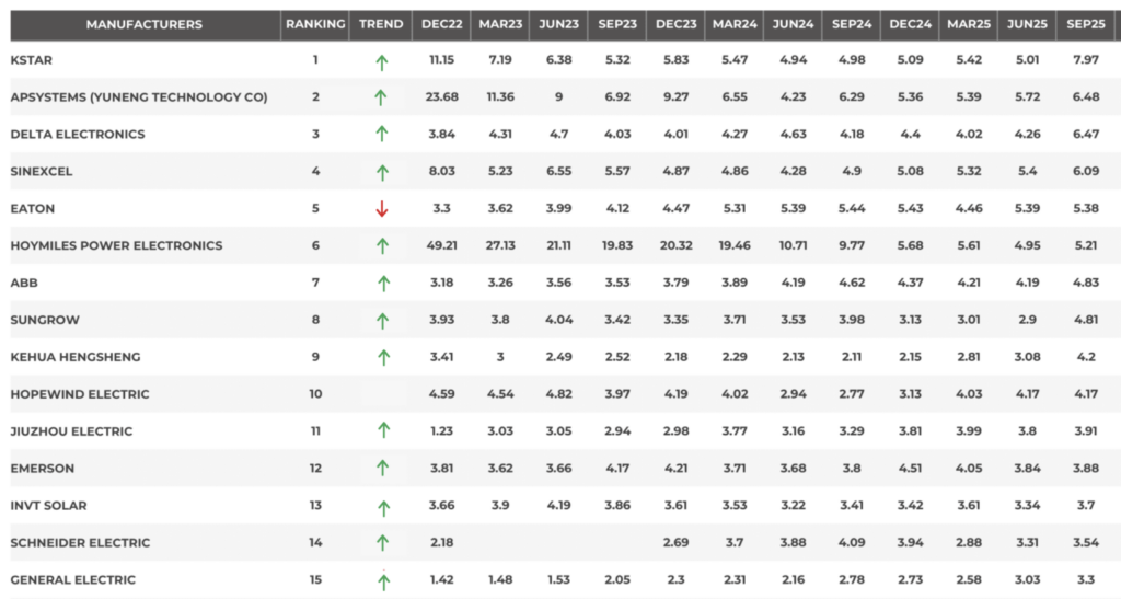 Las diez empresas con mejor puntuación fueron las siguientes: Kstar Science and Technology, con sede en China, APSystems (Yuneng Technology) y Delta Electronics, con sede en Taiwán, seguidas de Sinexcel, de China, Eaton, con sede en Irlanda, Hoymiles Power, de China, ABB, con sede en Suiza, Sungrow, Kehua Hengsheng y Hopewind, todas ellas con sede en China.