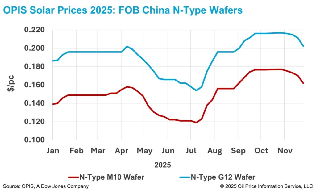 Los precios de las obleas de tipo N han seguido bajando por cuarta semana consecutiva. Según el informe semanal OPIS Solar publicado el 25 de noviembre, los precios FOB China de las obleas M10 se situaron en 0,162 dólares por unidad, lo que supone un descenso del 4,71 % con respecto a la semana anterior, mientras que las obleas G12 se cotizaron a 0,202 dólares por unidad, lo que refleja una disminución del 4,27 % con respecto a la semana anterior.