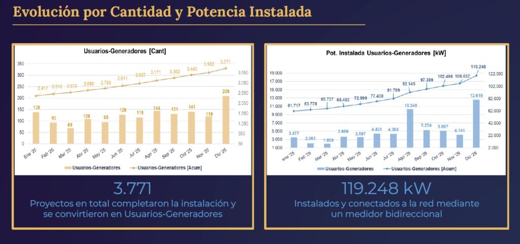 Durante 2025, se sumaron 1.492 usuarios generadores, lo que representó casi un 65 % de crecimiento respecto a los 2.279 con que cerró el año anterior. Por potencia, el año pasado se agregaron 61.007 kW, casi un 105 % más que lo marcó el final de 2025, cuando había 58.241 kW instalados