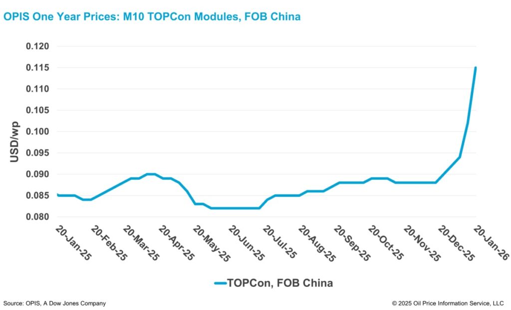 Según el Informe sobre los mercados solares mundiales de OPIS publicado el 20 de enero, el Chinese Module Marker (CMM), la evaluación de referencia de OPIS para los módulos TOPCon de China, subió un 12,75 % en la semana hasta situarse en 0,115 dólares/W franco a bordo (FOB) en China.