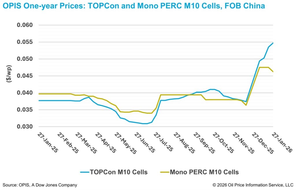 Según el informe OPIS Global Solar Markets Report publicado el 20 de enero, los precios de las células TOPCon M10 chinas se valoraron un 2,24 % más en la semana, a 0,0547 dólares/W franco a bordo (FOB) en China. Por su parte, las células Mono PERC M10 FOB China cayeron un 2,53 % hasta los 0,0463 dólares/W durante el mismo periodo.