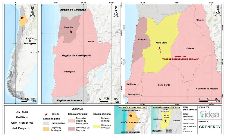 La filial de energías renovables de la empresa española Grenergy, Grenergy, IPP centrado en el desarrollo de proyectos fotovoltaicos, eólicos y de almacenamiento, ha presentado ante el Servicio de Evaluación Ambiental (SEA) el proyecto Parque Fotovoltaico Elena 2, que se someterá a Evaluación de Impacto Ambiental mediante una Declaración de Impacto Ambiental (DIA). La iniciativa se emplaza en la comuna de María Elena, provincia de Tocopilla, en la región de Antofagasta, a unos 60 kilómetros al noroeste del centro de la ciudad de Calama.