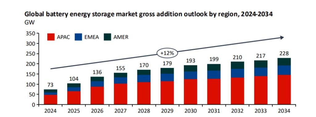 Se espera que el impulso de la implantación se acelere aún más en 2026, con unas adiciones globales de BESS que se prevé que superen los 130 GW/350 GWh. Los mercados consolidados, como China, Estados Unidos, Reino Unido, Australia y Alemania, seguirán liderando el sector, mientras que los mercados emergentes, entre los que se incluyen Italia, Arabia Saudí y Oriente Medio en general, Chile y Europa del Este, están ganando protagonismo a medida que se alinean los marcos políticos, las necesidades de la red y las carteras de proyectos.