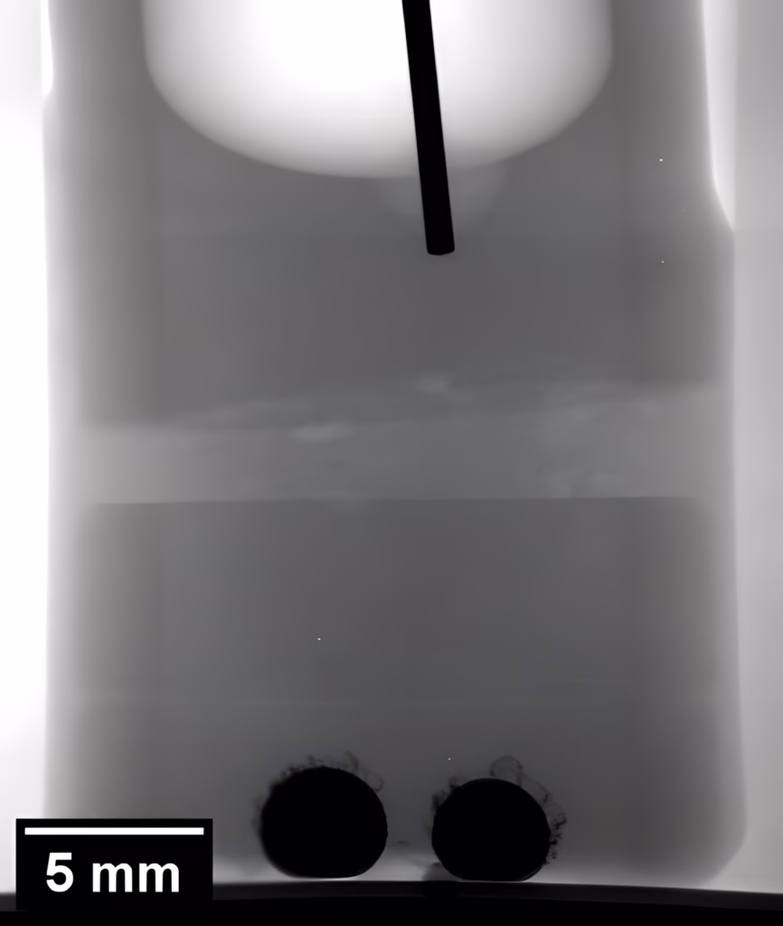 Radiografía de rayos X de una celda de sodio-zinc con ánodo de sodio (parte superior de la celda, área brillante alrededor del cable negro), diafragma (franja brillante en el centro de la celda) y cátodo de zinc (círculos negros en la base).