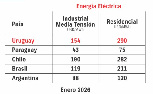 La tarifa eléctrica industrial en media tensión alcanzó en Uruguay los 154 dólares/MWh, según datos de un informe elaborado por SEG Ingeniería. En Chile fue de 190 dólares/MWh; en Brasil, 119 dólares/MWh; en Argentina, 88 dólares/MWh; y en Paraguay, 43 dólares/MWh. Esto muestra un incremento respecto a noviembre de 2025, cuando Uruguay presentó 142 dólares/MWh y Chile 180 dólares/MWh en el segmento industrial.