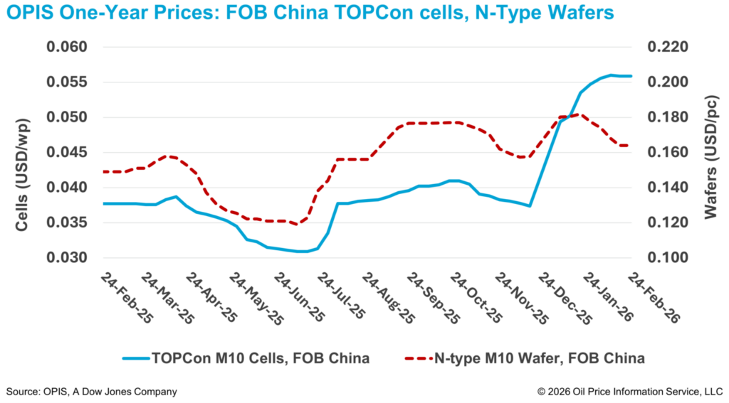 Las células TOPCon FOB (Free-On-Board) se mantuvieron estables esta semana en medio de una escasa actividad comercial durante la pausa festiva del Año Nuevo Lunar. Según el Informe sobre los mercados solares mundiales de OPIS publicado el 24 de febrero, los precios de las células TOPCon M10 FOB China se mantuvieron estables durante la semana en 0,0559 dólares/W.