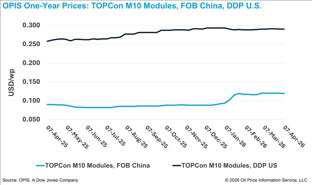 Según el mismo informe de OPIS, los precios DDP en EE. UU. de los módulos TOPCon se mantuvieron en 0,290 dólares/W esta semana. Las indicaciones prospectivas para el precio DDP de los módulos TOPCon en el primer trimestre de 2027 se evaluaron en 0,278 dólares/W. Las fuentes afirman que las recientes indicaciones de precios a plazo estarán sujetas a ajustes, dadas las investigaciones arancelarias pendientes y la incertidumbre política actual.