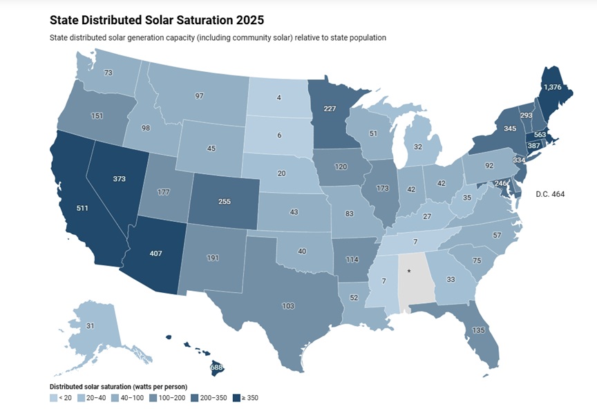 Maine superó a otros estados al alcanzar la mayor penetración de solar distribuida del país, con 700 W por persona. El crecimiento del estado estuvo impulsado en gran medida por la solar comunitaria, que representó el 53% de la capacidad solar total existente de Maine al final de 2025. Otros estados que mostraron un crecimiento significativo de capacidad distribuida desde 2024 incluyen a D.C., con un 45%; Virginia Occidental, con un 30%; y Montana, con un 27%.