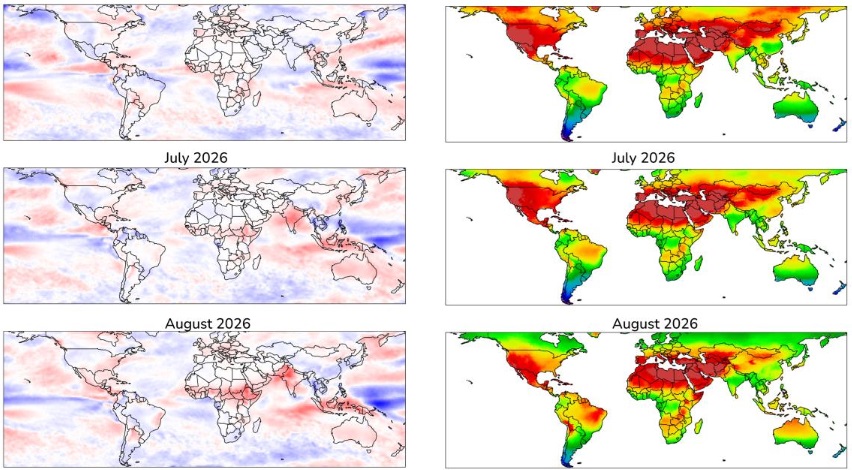 Las anomalías positivas más intensas se concentran en el sudeste asiático y Australasia, partes del sur de Asia hacia el final del periodo, la región del Sahel y sectores de África occidental, así como en América Central en agosto. En Europa, la tendencia general es de neutral a ligeramente positiva. Las anomalías negativas se observan principalmente en regiones afectadas por monzones al inicio de la temporada, aunque en varios casos se debilitan o revierten con el paso de las semanas.