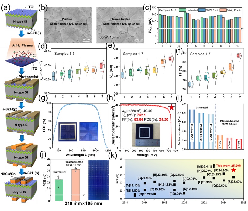 Probada bajo condiciones estándar de iluminación, la célula HJT alcanzó una eficiencia de conversión de potencia del 25,2%, una tensión de circuito abierto de 742,1 mV, una densidad de corriente de cortocircuito de 40,49 mA/cm² y un factor de llenado de 83,86%. Un dispositivo de referencia construido sin el tratamiento por plasma alcanzó una eficiencia de solo 21,10%, una tensión de circuito abierto de 724,1 mV y un factor de llenado de 71,5%, sin que se publicara el valor de densidad de cortocircuito.