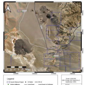 La empresa Lithium Mining Corporation (LMC) informa que el yacimiento, ubicado en la provincia de Catamarca, alcanzó concentraciones de litio de hasta 377 mg/L y contó con la recuperación de 20 000 litros de salmuera mineralizada, además de la detección de un acuífero de agua dulce apta para consumo humano. Se apunta a una futura producción en 2030 que ascendería a 30 000 toneladas por año de carbonato equivalente.