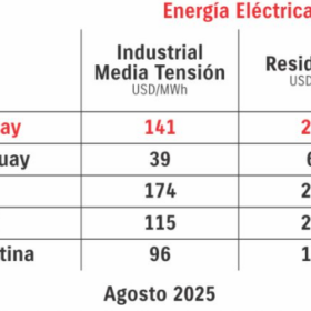 Según un estudio de la consultora uruguaya SEG Ingeniería, en agosto de este año, el precio residencial en Uruguay se ubicó en 269 dólares por MWh, el valor más alto de la región, mientras que Paraguay registró la tarifa más baja con 68 dólares por MWh.
